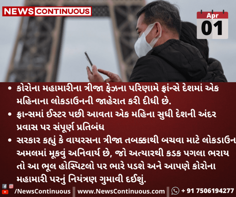 - કોરોના મહામારીના ત્રીજા ફેઝના પરિણામે ફ્રાંન્સે દેશમાં એક મહિનાના લોકડાઉનની જાહેરાત કરી દીધી છે.