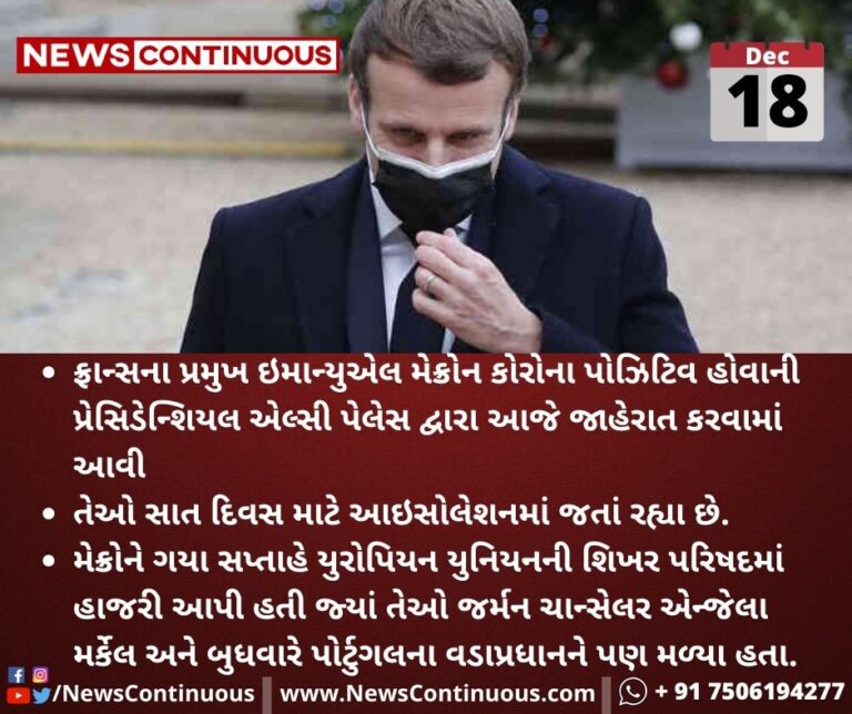 - ફ્રાન્સના પ્રમુખ ઇમાન્યુએલ મેક્રોન કોરોના પોઝિટિવ હોવાની પ્રેસિડેન્શિયલ એલ્સી પેલેસ દ્વારા આજે જાહેરાત કરવામાં આવી