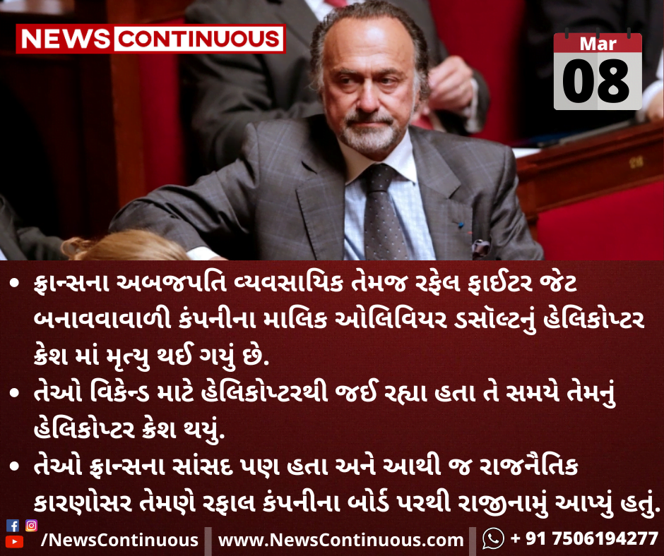 ફ્રાન્સના અબજપતિ વ્યવસાયિક તેમજ રફેલ ફાઈટર જેટ બનાવવાવાળી કંપનીના માલિક ઓલિવિયર ડસૉલ્ટનું હેલિકોપ્ટર ક્રેશ માં મૃત્યુ થઈ ગયું છે.