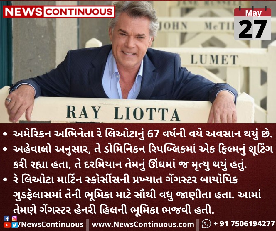અમેરિકન અભિનેતા(American actor) રે લિઓટાનું(Ray Liotta) 67 વર્ષની વયે અવસાન થયું છે.