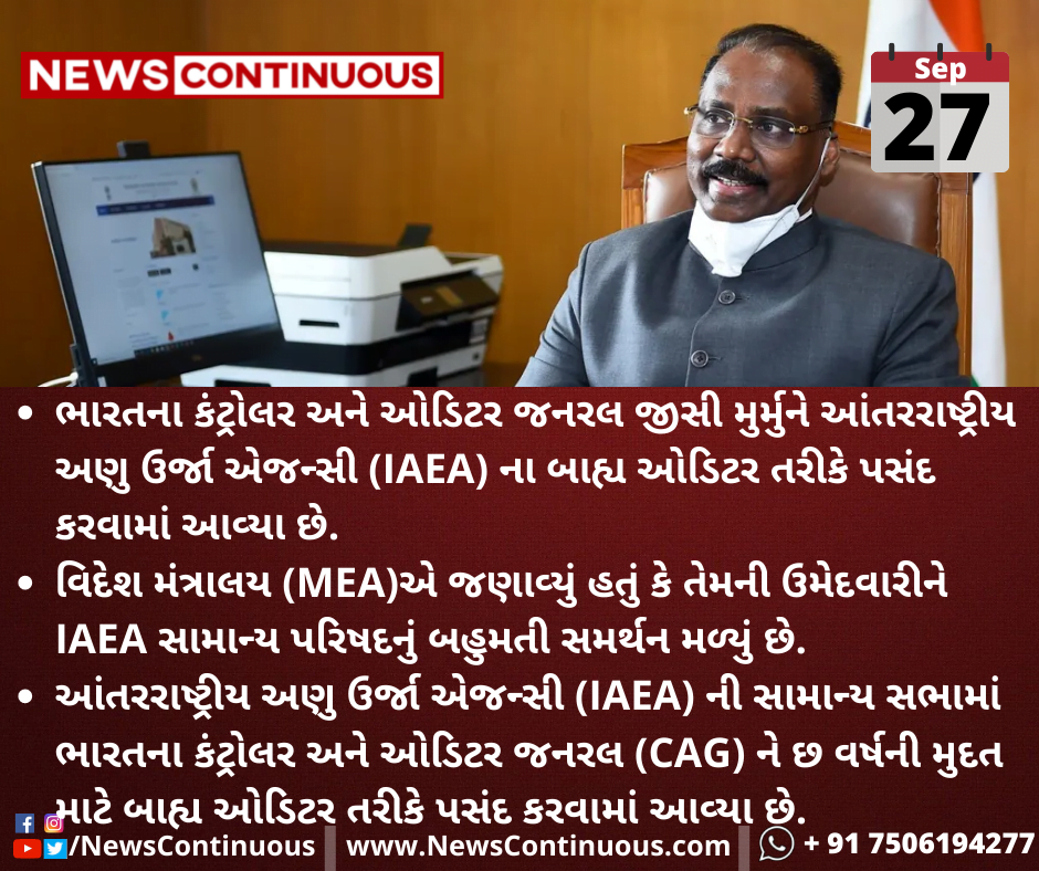 ભારતના કંટ્રોલર અને ઓડિટર જનરલ જીસી મુર્મુને આંતરરાષ્ટ્રીય અણુ ઉર્જા એજન્સી (IAEA) ના બાહ્ય ઓડિટર તરીકે પસંદ કરવામાં આવ્યા છે.