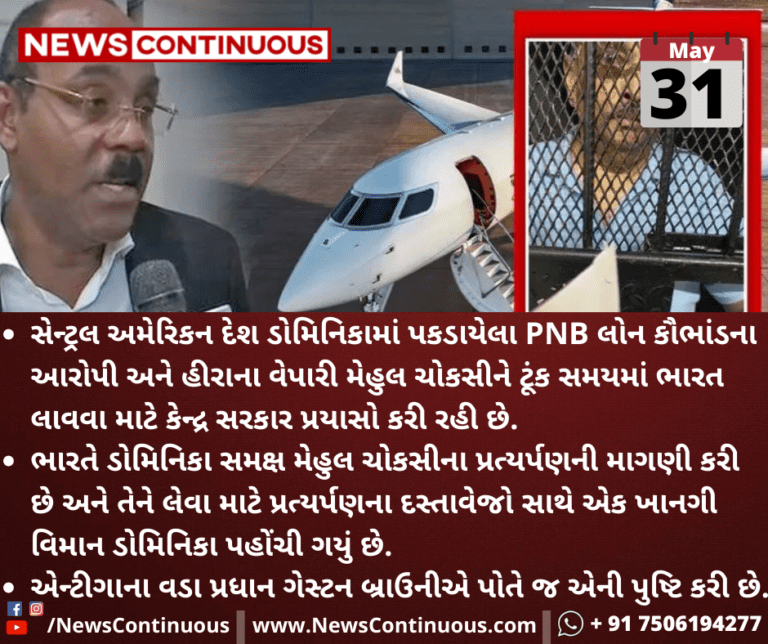 સેન્ટ્રલ અમેરિકન દેશ ડોમિનિકામાં પકડાયેલા PNB લોન કૌભાંડના આરોપી અને હીરાના વેપારી મેહુલ ચોકસીને ટૂંક સમયમાં ભારત લાવવા માટે કેન્દ્ર સરકાર પ્રયાસો કરી રહી છે.