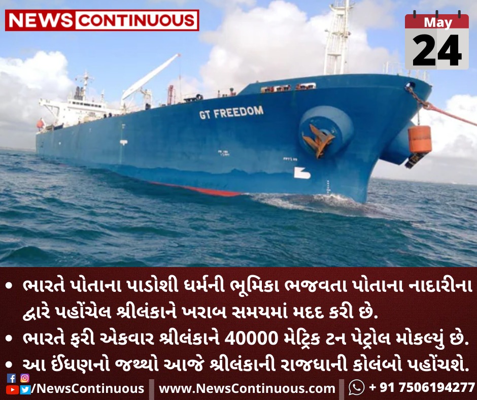 ભારતે ફરી એકવાર શ્રીલંકાને 40000 મેટ્રિક ટન પેટ્રોલ(Petrol) મોકલ્યું છે.