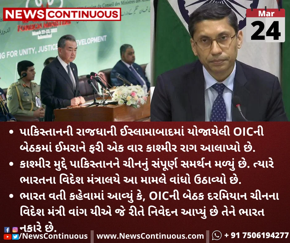 ભારત વતી કહેવામાં આવ્યું કે, OICની બેઠક દરમિયાન ચીનના વિદેશ મંત્રી વાંગ યીએ જે રીતે નિવેદન આપ્યું છે તેને ભારત નકારે છે.