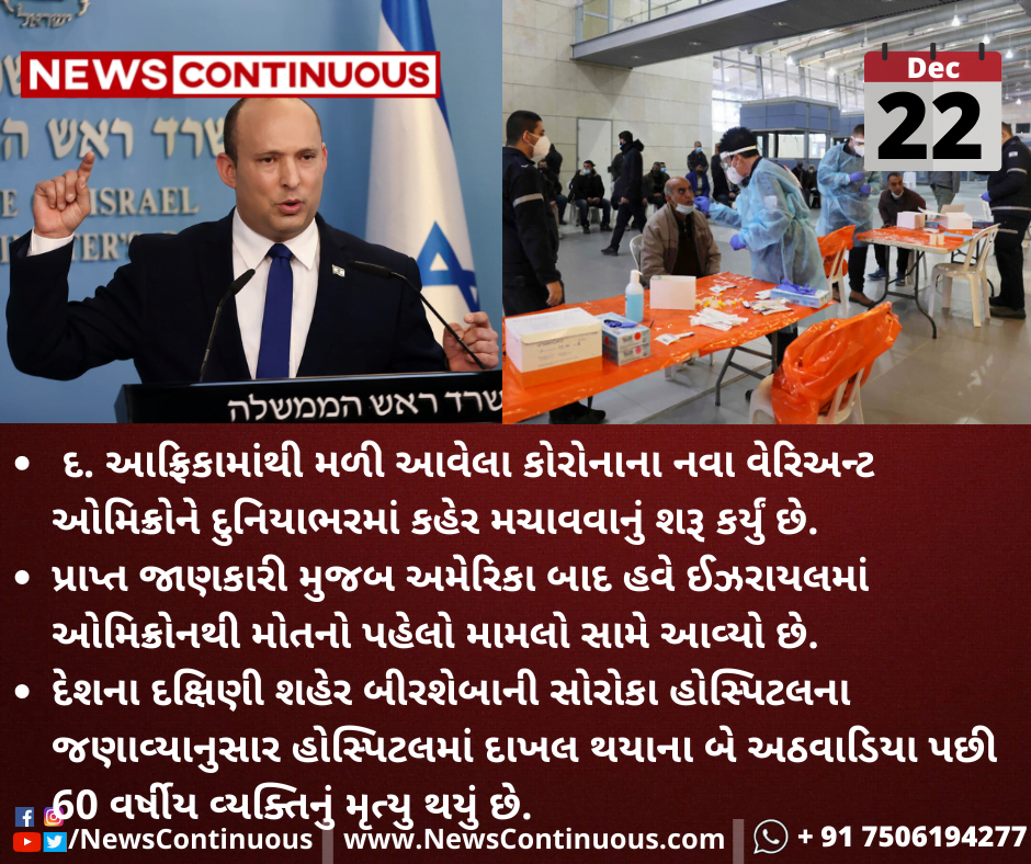 પ્રાપ્ત જાણકારી મુજબ અમેરિકા બાદ હવે ઈઝરાયલમાં ઓમિક્રોનથી મોતનો પહેલો મામલો સામે આવ્યો છે.