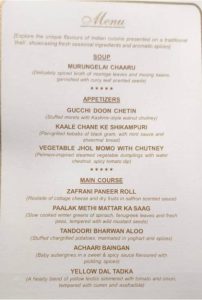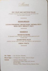 રાત્રિભોજનમાં એપેટાઇઝર તરીકે શીખમપુરી અને મસાલેદાર ચટણી સાથે વેજીટેબલ ઝોલ મોમો જેવી વાનગીઓનો સમાવેશ થતો હતો. મુખ્ય વાનગીઓમાં જાફરાની પનીર રોલ, પાલક મેથી મટ કા સાગ, તંદૂરી ભરવાં આલૂ, અચારી બેંગન અને પીળી દાળ તડકા જેવી વાનગીઓ હતી. આ ઉપરાંત, સૂકા મેવા અને કેસર પુલાવ સાથે લચ્છા પરાઠા, મગજ નાન, સતનાજ રોટી અને મિસ્સી રોટી પણ પીરસવામાં આવી હતી.