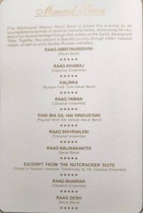 રાત્રિભોજન દરમિયાન બેકગ્રાઉન્ડમાં નૌસેના બેન્ડ દ્વારા શાસ્ત્રીય સંગીત અને બોલિવૂડની ધૂન વગાડવામાં આવી હતી. આ દરમિયાન અમૃતવર્ષિણી, ખમાજ, યમન, શિવરંજિની, નલિનકંઠી, ભૈરવી અને દેશ જેવા ભારતીય રાગ વગાડવામાં આવ્યા હતા. આ સાથે રશિયાની ‘કાલિન્કા’ ધૂન પણ સંભળાઈ હતી. આ ઉપરાંત, અભિનેતા શાહરૂખ ખાનની ફિલ્મ ‘ફિર ભી દિલ હૈ હિન્દુસ્તાની’ની ધૂન પણ વગાડવામાં આવી હતી.