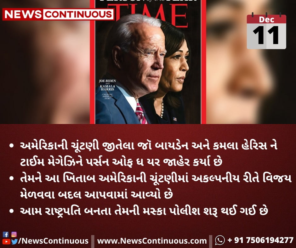 અમેરિકાની ચૂંટણી જીતેલા જૉ બાયડેન અને કમલા હેરિસ ને ટાઈમ મેગેઝિને પર્સન ઓફ ધ યર જાહેર કર્યા છે