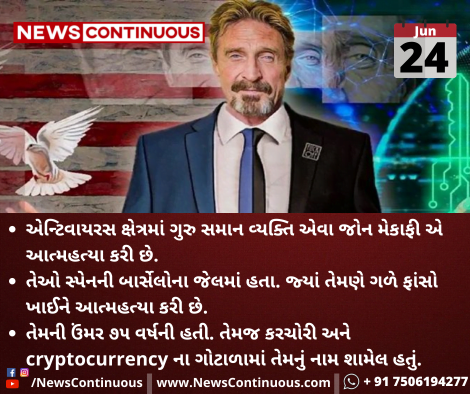 એન્ટિવાયરસ ક્ષેત્રમાં ગુરુ સમાન વ્યક્તિ એવા જોન મેકાફી એ આત્મહત્યા કરી છે.