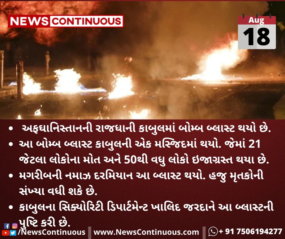 આ બોમ્બ બ્લાસ્ટ કાબુલની એક મસ્જિદમાં થયો. જેમાં 21 જેટલા લોકોના મોત અને 50થી વધુ લોકો ઇજાગ્રસ્ત થયા છે.