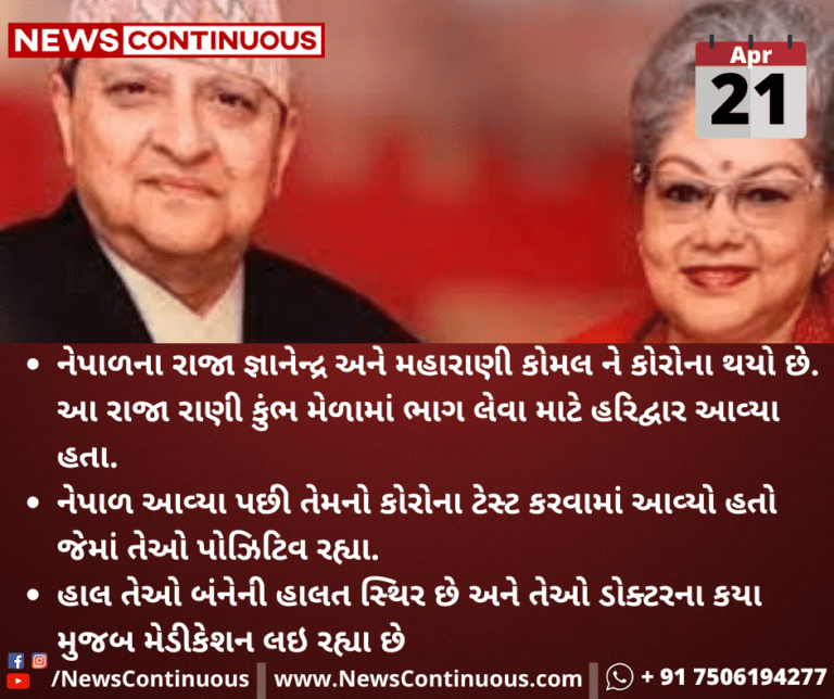 નેપાળના રાજા જ્ઞાનેન્દ્ર અને મહારાણી કોમલ ને કોરોના થયો છે. આ રાજા રાણી કુંભ મેળામાં ભાગ લેવા માટે હરિદ્વાર આવ્યા હતા.