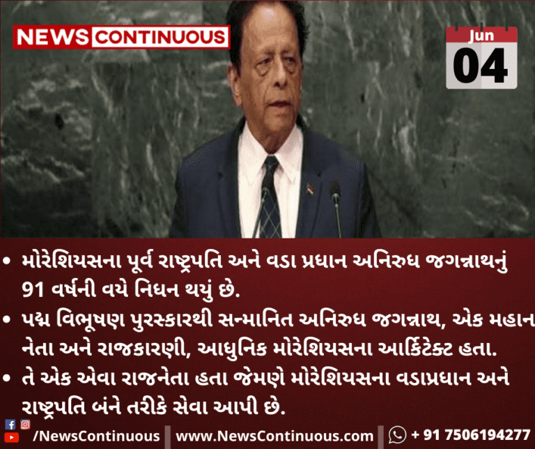મોરેશિયસના પૂર્વ રાષ્ટ્રપતિ અને વડા પ્રધાન અનિરુધ જગન્નાથનું 91 વર્ષની વયે નિધન થયું છે.