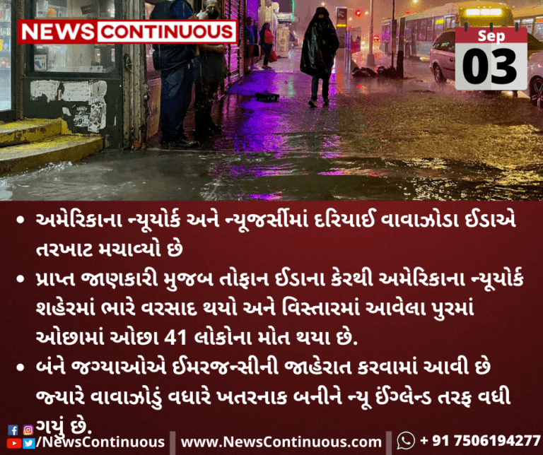 અમેરિકાના ન્યૂયોર્ક અને ન્યૂજર્સીમાં દરિયાઈ વાવાઝોડા ઈડાએ તરખાટ મચાવ્યો છે