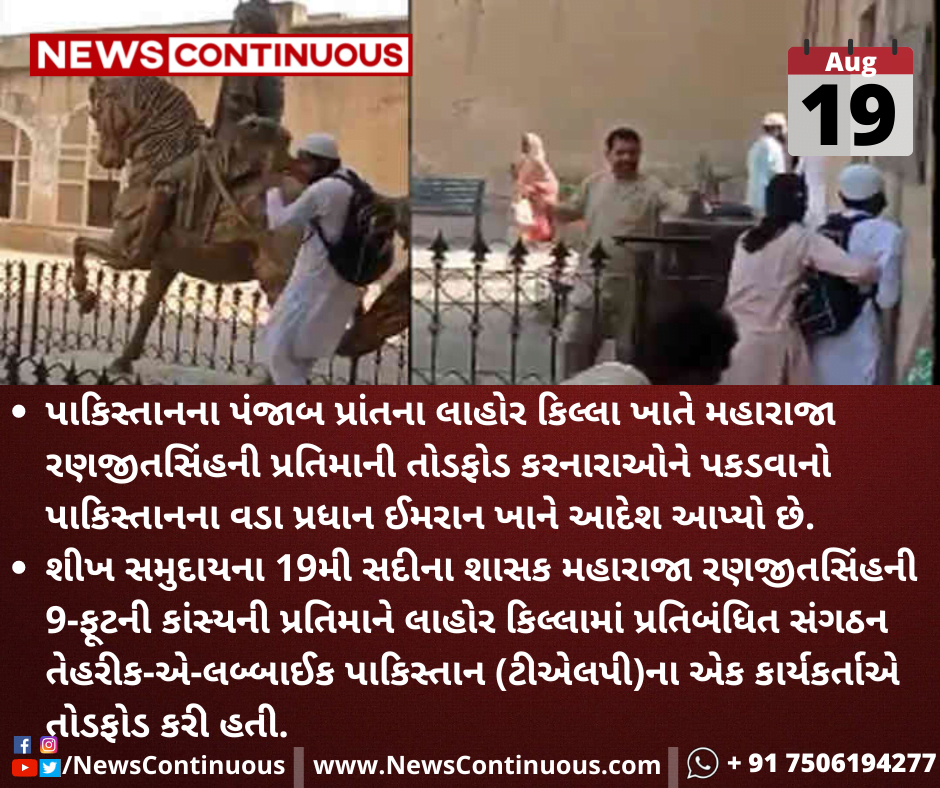 શીખ સમુદાયના 19મી સદીના શાસક મહારાજા રણજીતસિંહની 9-ફૂટની કાંસ્યની પ્રતિમાને લાહોર કિલ્લામાં પ્રતિબંધિત સંગઠન તેહરીક-એ-લબ્બાઈક પાકિસ્તાન (ટીએલપી)ના એક કાર્યકર્તાએ તોડફોડ કરી હતી.