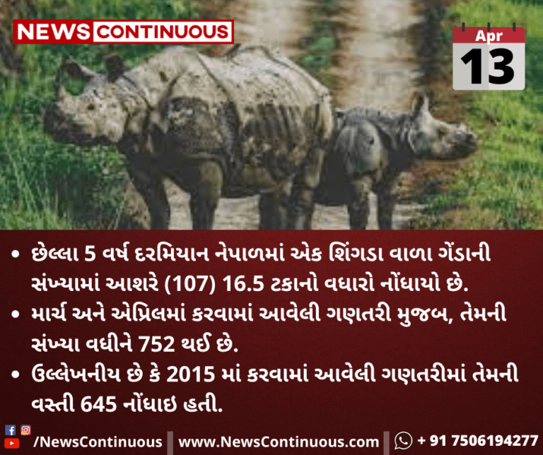 છેલ્લા 5 વર્ષ દરમિયાન નેપાળમાં એક શિંગડા વાળા ગેંડાની સંખ્યામાં આશરે (107) 16.5 ટકાનો વધારો નોંધાયો છે.