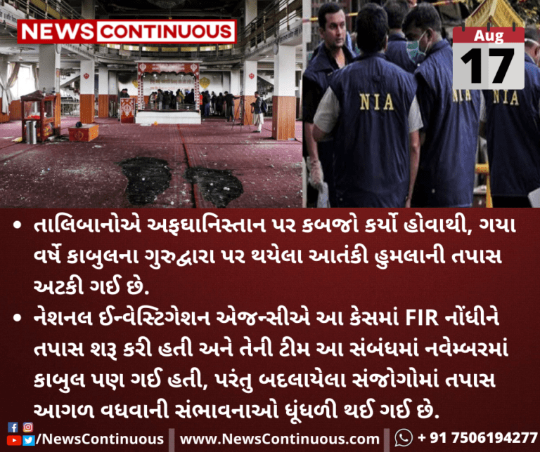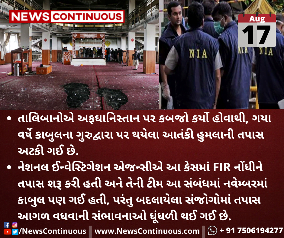તાલિબાનોએ અફઘાનિસ્તાન પર કબજો કર્યો હોવાથી, ગયા વર્ષે કાબુલના ગુરુદ્વારા પર થયેલા આતંકી હુમલાની તપાસ અટકી ગઈ છે.