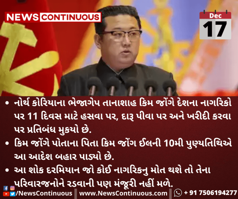 નોર્થ કોરિયાના ભેજાગેપ તાનાશાહ કિમ જોંગે દેશના નાગરિકો પર 11 દિવસ માટે હસવા પર, દારૂ પીવા પર અને ખરીદી કરવા પર પ્રતિબંધ મુકયો છે.