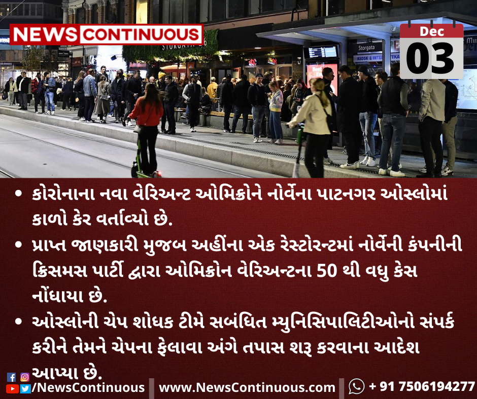 પ્રાપ્ત જાણકારી મુજબ અહીંના એક રેસ્ટોરન્ટમાં નોર્વેની કંપનીની ક્રિસમસ પાર્ટી દ્વારા ઓમિક્રોન વેરિઅન્ટના 50 થી વધુ કેસ નોંધાયા છે.