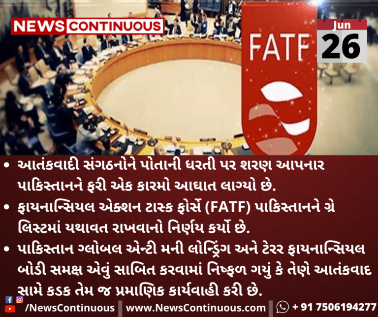ફાયનાન્સિયલ એક્શન ટાસ્ક ફોર્સે (FATF) પાકિસ્તાનને ગ્રે લિસ્ટમાં યથાવત રાખવાનો નિર્ણય કર્યો છે.