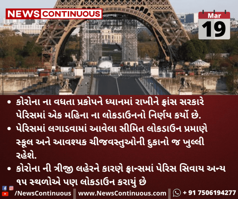 કોરોના ના વધતા પ્રકોપને ધ્યાનમાં રાખીને ફ્રાંસ સરકારે પેરિસમાં એક મહિના ના લોકડાઉનનો નિર્ણય કર્યો છે.