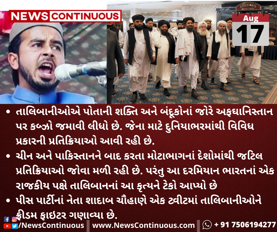 તાલિબાનીઓએ પોતાની શક્તિ અને બંદૂકોનાં જોરે અફઘાનિસ્તાન પર કબ્ઝો જમાવી લીધો છે. જેના માટે દુનિયાભરમાંથી વિવિધ પ્રકારની પ્રતિક્રિયાઓ આવી રહી છે.