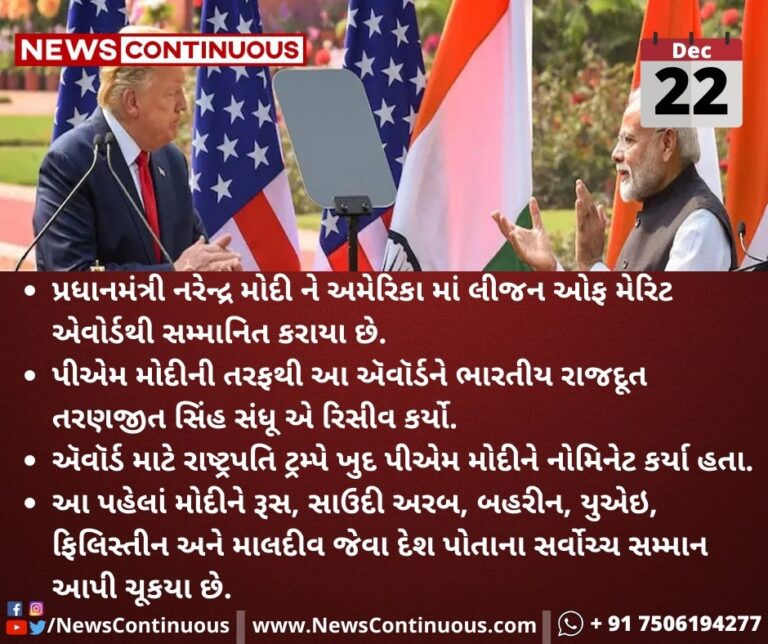 - પ્રધાનમંત્રી નરેન્દ્ર મોદી ને અમેરિકા માં લીજન ઓફ મેરિટ એવોર્ડથી સમ્માનિત કરાયા છે.