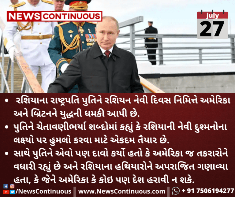 રશિયાના રાષ્ટ્રપતિ પુતિને રશિયન નેવી દિવસ નિમિત્તે અમેરિકા અને બ્રિટનને યુદ્ધની ધમકી આપી છે.