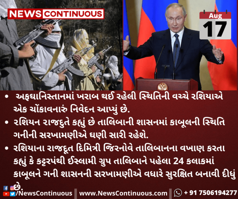 અફઘાનિસ્તાનમાં રશિયાના રાજદૂત દિમિત્રી જિરનોવે તાલિબાનના વખાણ કરતા કહ્યું કે કટ્ટરપંથી ઈસ્લામી ગ્રુપ તાલિબાને પહેલા 24 કલાકમાં કાબૂલને ગની શાસનની સરખામણીએ વધારે સુરક્ષિત બનાવી દીધું છે.