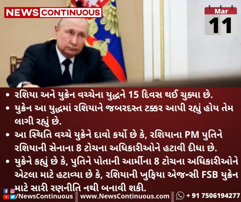 આ સ્થિતિ વચ્ચે યુક્રેને દાવો કર્યો છે કે, રશિયાના રાષ્ટ્રપતિ પુતિને રશિયાની સેનાના 8 ટોચના અધિકારીઓને હટાવી દીધા છે.