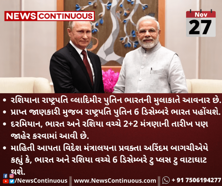 પ્રાપ્ત જાણકારી મુજબ રાષ્ટ્રપતિ પુતિન 6 ડિસેમ્બરે ભારત પહોંચશે.