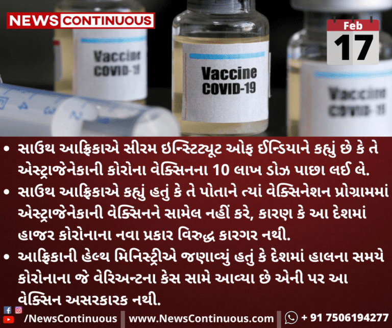 સાઉથ આફ્રિકાએ સીરમ ઇન્સ્ટિટ્યૂટ ઓફ ઈન્ડિયાને કહ્યું છે કે તે એસ્ટ્રાજેનેકાની કોરોના વેક્સિનના 10 લાખ ડોઝ પાછા લઈ લે.
