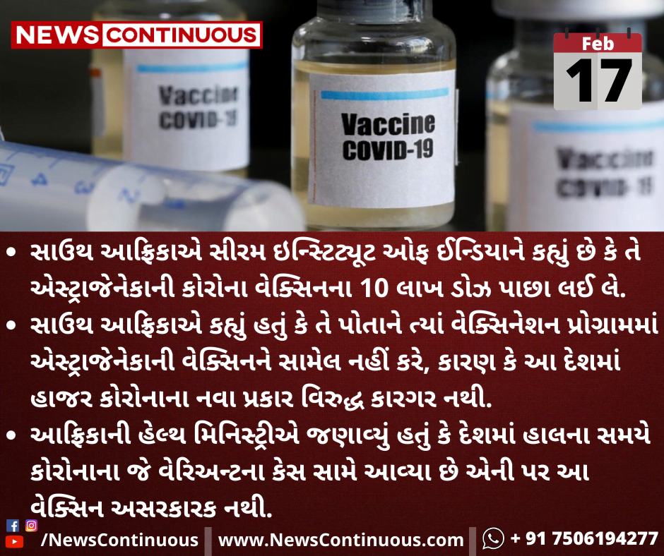 સાઉથ આફ્રિકાએ કહ્યું હતું કે તે પોતાને ત્યાં વેક્સિનેશન પ્રોગ્રામમાં એસ્ટ્રાજેનેકાની વેક્સિનને સામેલ નહીં કરે, કારણ કે આ દેશમાં હાજર કોરોનાના નવા પ્રકાર વિરુદ્ધ કારગર નથી.