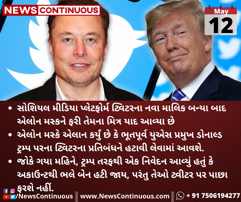 એલોન મસ્કે એલાન કર્યું છે કે ભૂતપૂર્વ યુએસ પ્રમુખ(EX president) ડોનાલ્ડ ટ્રમ્પ(Donald trump) પરના ટ્વિટરના પ્રતિબંધને હટાવી લેવામાં આવશે.