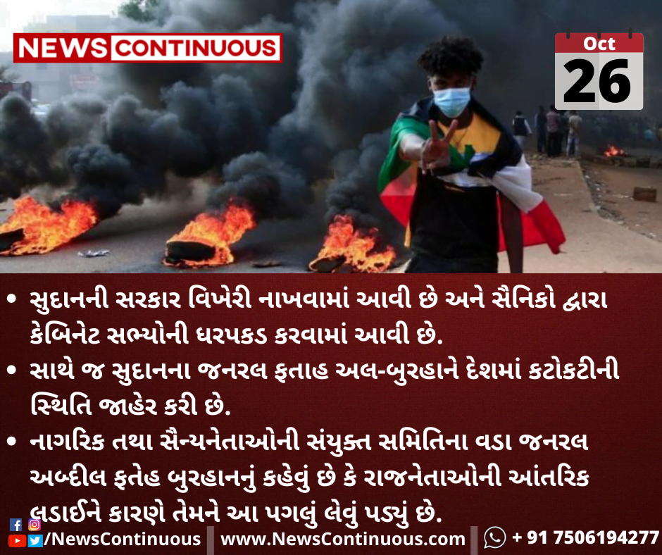 સુદાનની સરકાર વિખેરી નાખવામાં આવી છે અને સૈનિકો દ્વારા કેબિનેટ સભ્યોની ધરપકડ કરવામાં આવી છે.