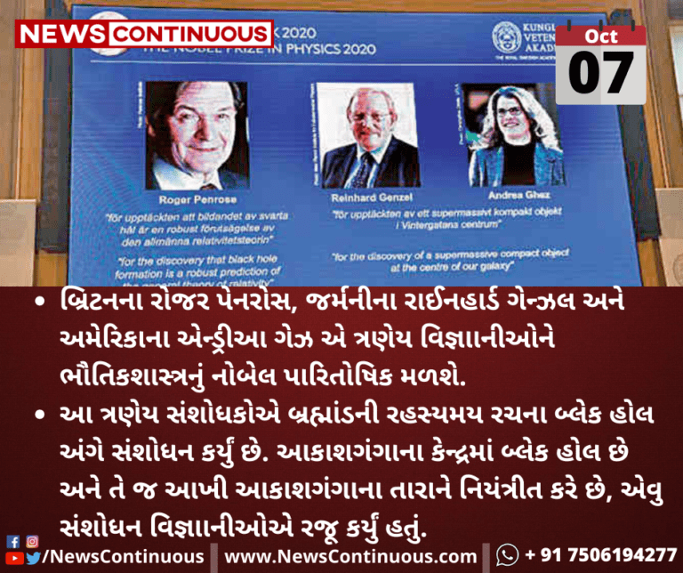 બ્લેક હોલના સંશોધન માટે ત્રણ વિજ્ઞાનીને ફિઝિક્સનું નોબેલ