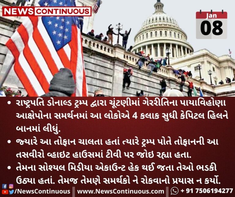 - રાષ્ટ્રપતિ ડોનાલ્ડ ટ્રમ્પ દ્વારા ચૂંટણીમાં ગેરરીતિના પાયાવિહોણા આક્ષેપોના સમર્થનમાં આ લોકોએ 4 કલાક સુધી કેપિટલ હિલને બાનમાં લીધું.