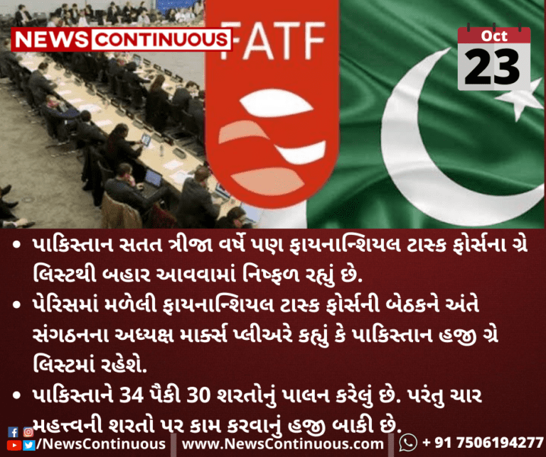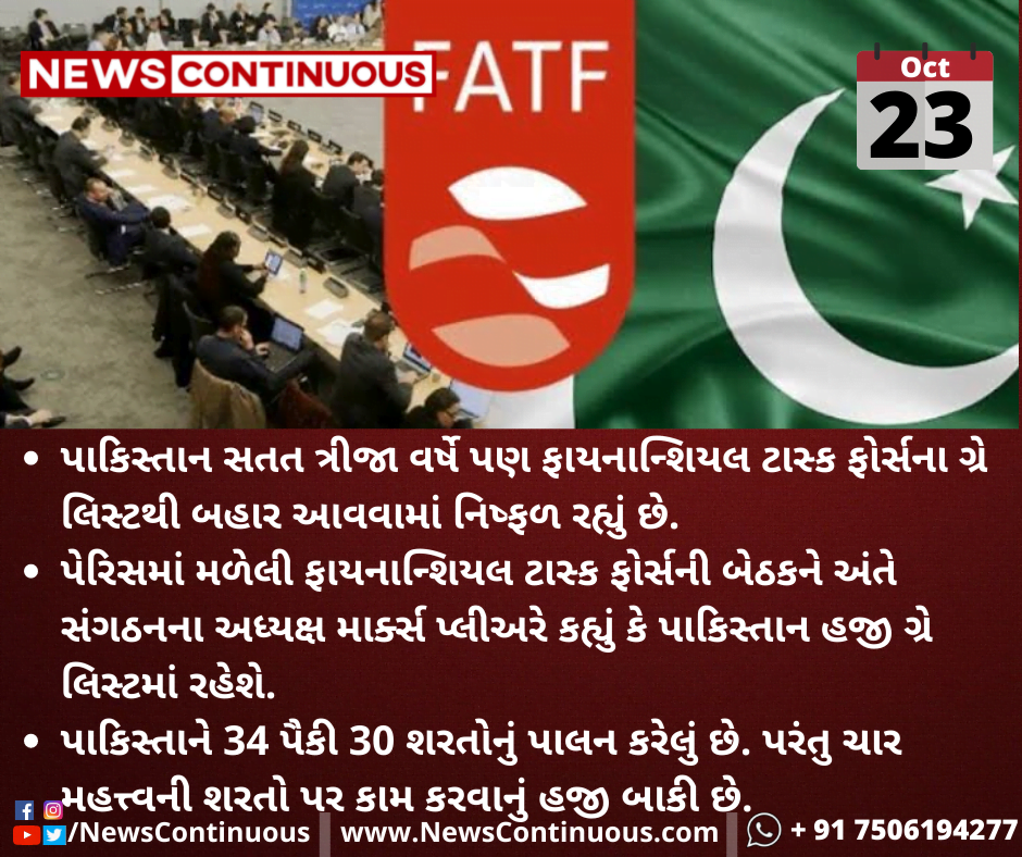પાકિસ્તાન સતત ત્રીજા વર્ષે પણ ફાયનાન્શિયલ ટાસ્ક ફોર્સના ગ્રે લિસ્ટથી બહાર આવવામાં નિષ્ફળ રહ્યું છે.