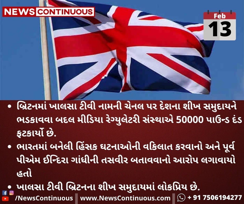 બ્રિટનમાં ખાલસા ટીવી નામની ચેનલ પર દેશના શીખ સમુદાયને ભડકાવવા બદલ મીડિયા રેગ્યુલેટરી સંસ્થાએ 50000 પાઉન્ડ દંડ ફટકાર્યો છે.