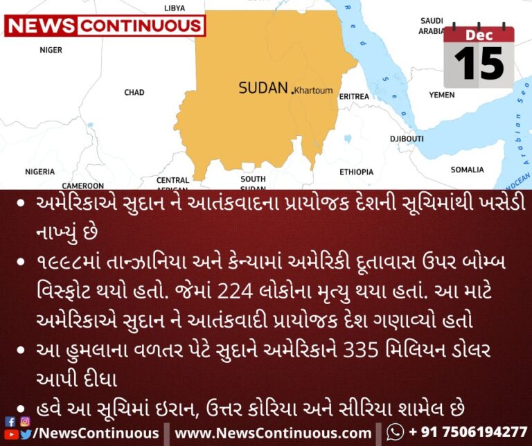 અમેરિકાએ સુદાન ને આતંકવાદના પ્રાયોજક દેશની સૂચિમાંથી ખસેડી નાખ્યું છે.