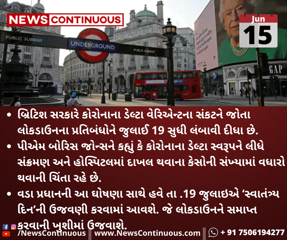 બ્રિટિશ સરકારે કોરોનાના ડેલ્ટા વેરિએન્ટના સંકટને જોતા લોકડાઉનના પ્રતિબંધોને જુલાઈ 19 સુધી લંબાવી દીધા છે.