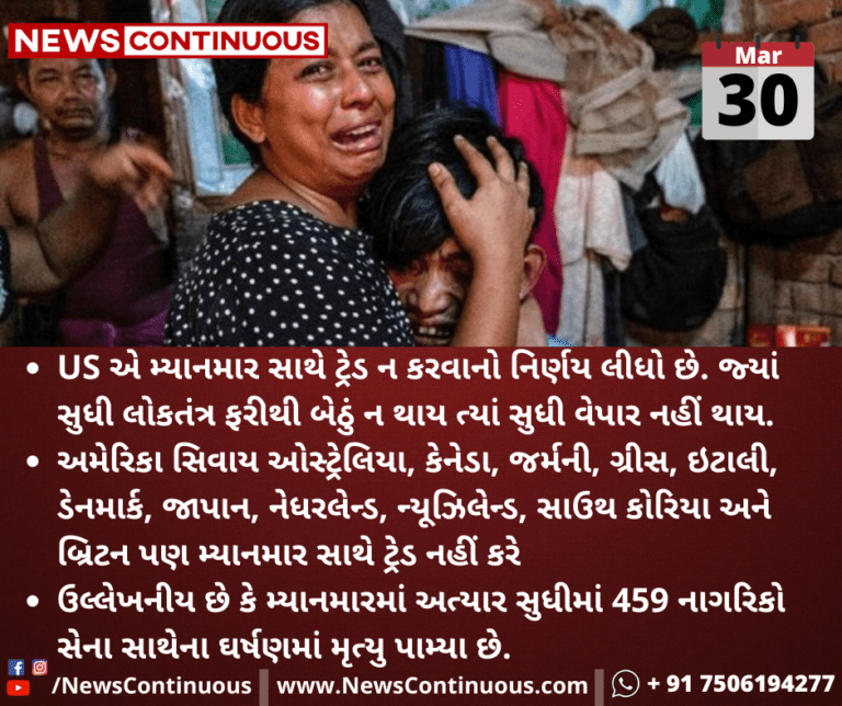 - US એ મ્યાનમાર સાથે ટ્રેડ ન કરવાનો નિર્ણય લીધો છે. જ્યાં સુધી લોકતંત્ર ફરીથી બેઠું ન થાય ત્યાં સુધી વેપાર નહીં થાય.