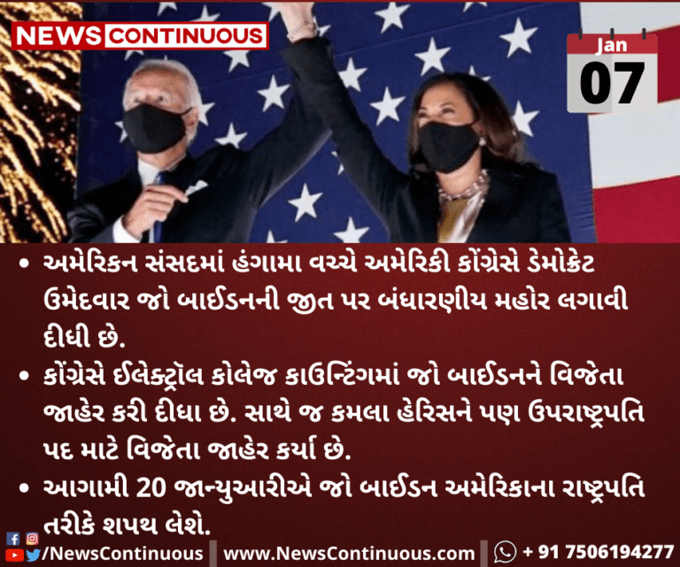 અમેરિકન સંસદમાં હંગામા વચ્ચે અમેરિકી કોંગ્રેસે ડેમોક્રેટ ઉમેદવાર જો બાઈડનની જીત પર બંધારણીય મહોર લગાવી દીધી છે.