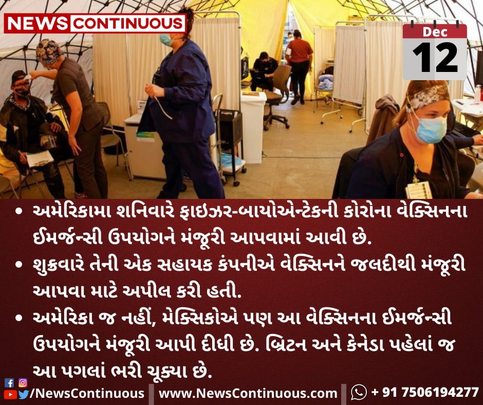 અમેરિકામા શનિવારે ફાઇઝર-બાયોએન્ટેકની કોરોના વેક્સિનના ઈમર્જન્સી ઉપયોગને મંજૂરી આપવામાં આવી છે.