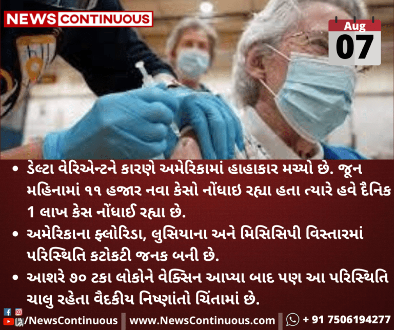 ડેલ્ટા વેરિએન્ટને કારણે અમેરિકામાં હાહાકાર મચ્યો છે. જૂન મહિનામાં ૧૧ હજાર નવા કેસો નોંધાઇ રહ્યા હતા ત્યારે હવે દૈનિક 1 લાખ કેસ નોંધાઈ રહ્યા છે.