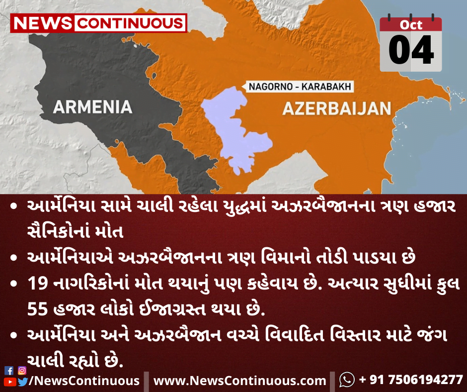 આર્મેનિયા અને અઝરબૈજાન નું યુદ્ધ વકર્યું. અઝરબૈજાનના ત્રણ હજાર સૈનિકોનાં મોત.