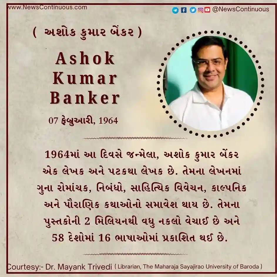 1964માં આ દિવસે જન્મેલા, અશોક કુમાર બેંકર એક લેખક અને પટકથા લેખક છે. તેમના લેખનમાં ગુના રોમાંચક, નિબંધો, સાહિત્યિક વિવેચન, કાલ્પનિક અને પૌરાણિક કથાઓનો સમાવેશ થાય છે. તેમના પુસ્તકોની 2 મિલિયનથી વધુ નકલો વેચાઈ છે અને 58 દેશોમાં 16 ભાષાઓમાં પ્રકાશિત થઈ છે. તેમની એપિક ઈન્ડિયા લાઇબ્રેરી એ ભારતીય ઉપખંડના તમામ દંતકથાઓ, દંતકથાઓ અને ઇતિહાસને 70 થી વધુ ખંડો ધરાવતા એક વાર્તા ચક્રમાં ફરીથી કહેવાનો પ્રયાસ છે.