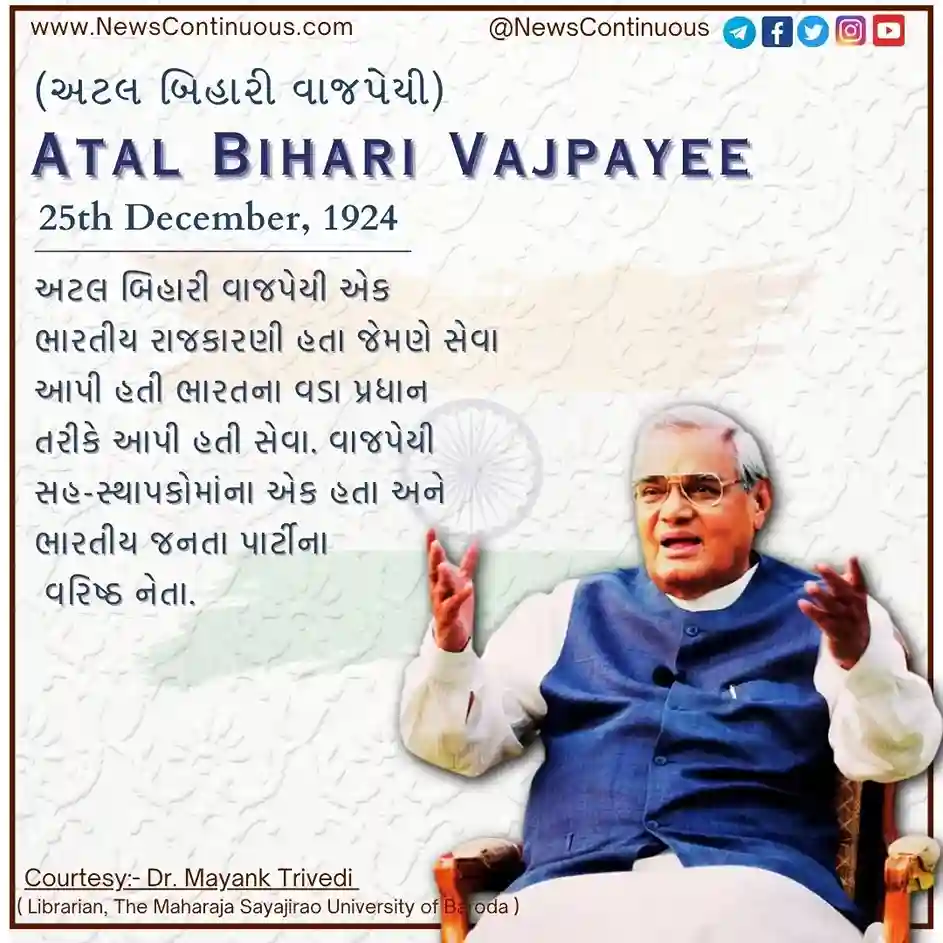 Atal Bihari Vajpayee: 25 ડિસેમ્બર 1924માં જન્મેલા અટલ બિહારી વાજપેયી એક ભારતીય રાજકારણી હતા જેમણે સેવા આપી હતી ભારતના વડા પ્રધાન તરીકે ત્રણ કાર્યકાળ, પ્રથમ 1996 માં 13 દિવસની મુદત માટે, પછી 1998 થી 1999 સુધીના 13 મહિનાના સમયગાળા માટે, ત્યારબાદ 1999 થી 2004 સુધી સંપૂર્ણ કાર્યકાળ. વાજપેયી સહ-સ્થાપકોમાંના એક હતા અને ભારતીય જનતા પાર્ટીના વરિષ્ઠ નેતા. તેઓ હિન્દુ રાષ્ટ્રવાદી સ્વયંસેવક સંગઠન રાષ્ટ્રીય સ્વયંસેવક સંઘના સભ્ય હતા. તેઓ એવા પ્રથમ ભારતીય વડા પ્રધાન હતા જેઓ ભારતીય રાષ્ટ્રીય કોંગ્રેસના ન હતા, જેમણે ઓફિસમાં સંપૂર્ણ મુદત સેવા આપી હતી. તેઓ કવિ અને લેખક તરીકે પણ જાણીતા છે. તેમને 1992માં પદ્મ વિભૂષણ અને 2015માં ભારત રત્ન મળ્યો હતો.
