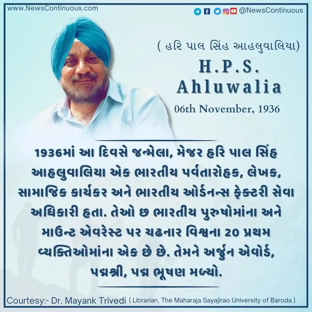 H. P. S. Ahluwalia : 1936 માં આ દિવસે જન્મેલા, મેજર હરિ પાલ સિંહ આહલુવાલિયા એક ભારતીય પર્વતારોહક ( Indian mountaineer ) , લેખક, સામાજિક કાર્યકર અને ભારતીય ઓર્ડનન્સ ફેક્ટરી સેવા અધિકારી હતા. તેઓ છ ભારતીય પુરુષોમાંના અને માઉન્ટ એવરેસ્ટ પર ચઢનાર વિશ્વના 20 પ્રથમ વ્યક્તિઓમાંના એક છે છે. તેમને અર્જુન એવોર્ડ, પદ્મશ્રી, પદ્મ ભૂષણ મળ્યો.