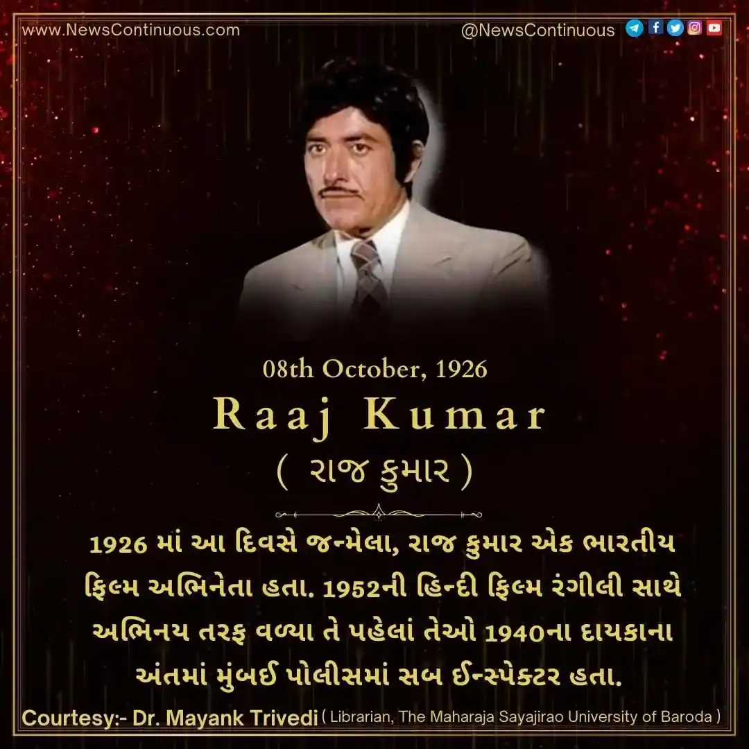 Raaj Kumar : 1926 માં આ દિવસે જન્મેલા, રાજ કુમાર એક ભારતીય ફિલ્મ અભિનેતા ( Indian film actor ) હતા. 1952ની હિન્દી ફિલ્મ રંગીલી સાથે અભિનય તરફ વળ્યા તે પહેલાં તેઓ 1940ના દાયકાના અંતમાં મુંબઈ પોલીસમાં સબ ઈન્સ્પેક્ટર હતા. તેઓ 1957ની ઓસ્કાર-નોમિનેટેડ ફિલ્મ મધર ઈન્ડિયામાં દેખાયા અને ચાર દાયકાથી વધુ લાંબી કારકિર્દીમાં 70 થી વધુ હિન્દી ફિલ્મોમાં અભિનય કર્યો.