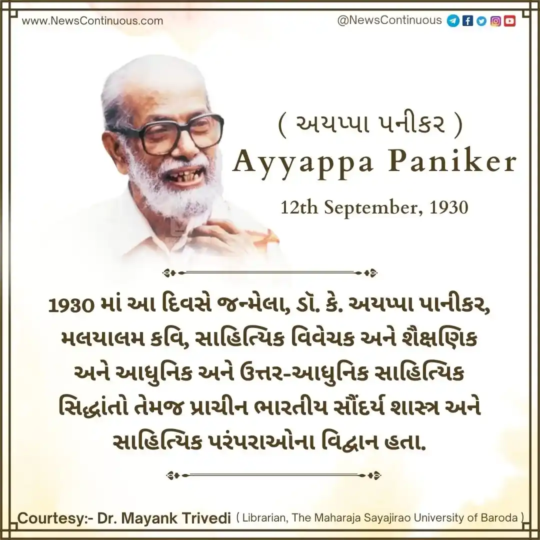 Ayyappa Paniker : 1930 માં આ દિવસે જન્મેલા, ડૉ. કે. અયપ્પા પાનીકર, મલયાલમ કવિ ( Malayalam poet ) , સાહિત્યિક વિવેચક અને શૈક્ષણિક અને આધુનિક અને ઉત્તર-આધુનિક સાહિત્યિક સિદ્ધાંતો તેમજ પ્રાચીન ભારતીય સૌંદર્ય શાસ્ત્ર અને સાહિત્યિક પરંપરાઓના વિદ્વાન હતા. તેઓ ( K. Ayyappa Paniker ) મલયાલમ કવિતામાં આધુનિકતાવાદના પ્રણેતાઓમાંના એક હતા, જ્યાં કુરુક્ષેત્રમ (1960) જેવી તેમની મુખ્ય કૃતિઓને મલયાલમ કવિતામાં એક વળાંક માનવામાં આવે છે.